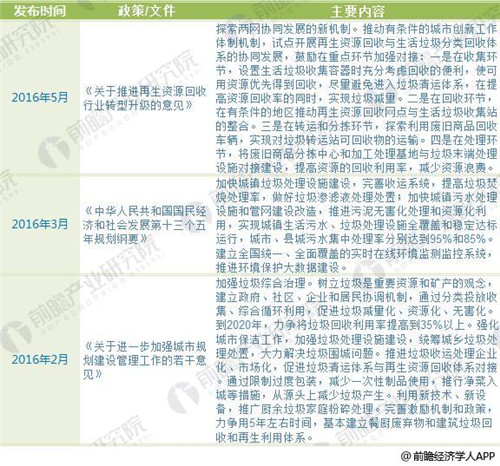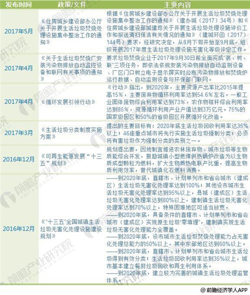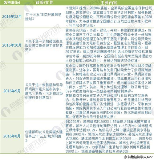 垃圾处理行业作为市政基础设施建设的重点领域之一,其市场属于政策驱动型市场,国家宏观政策和产业政策的走向直接影响城市生活垃圾处理行业的发展方向,近年来国家出台了一系列有利于垃圾处理行业发展的政策,前瞻产业研究院发布的《2018-2023年中国生活垃圾处理行业发展前景与投资预测分析报告》对此进行了全面的汇总。