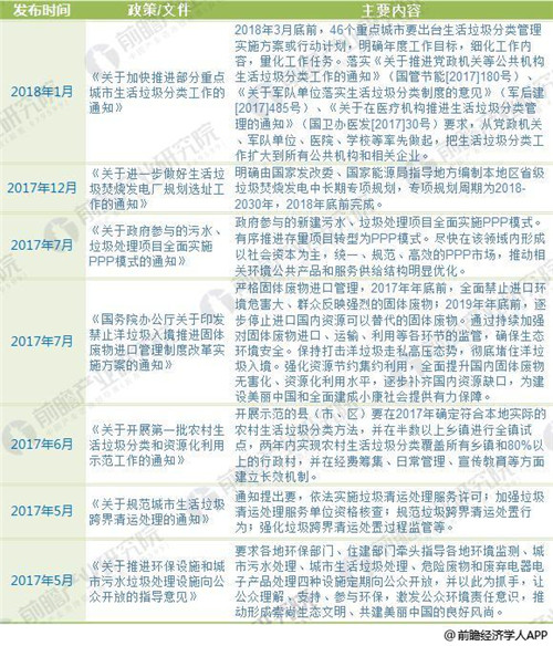 垃圾处理行业作为市政基础设施建设的重点领域之一,其市场属于政策驱动型市场,国家宏观政策和产业政策的走向直接影响城市生活垃圾处理行业的发展方向,近年来国家出台了一系列有利于垃圾处理行业发展的政策,前瞻产业研究院发布的《2018-2023年中国生活垃圾处理行业发展前景与投资预测分析报告》对此进行了全面的汇总。