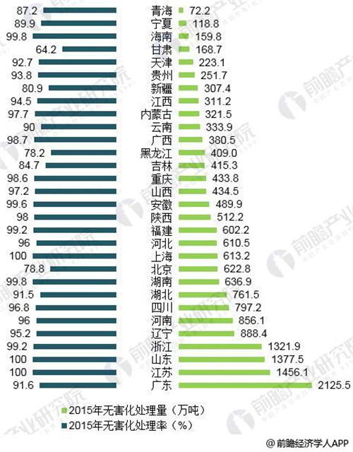 前瞻产业研究院数据显示,广东是全国生活垃圾处理量最高的省份,但处理率仍有待提高。江苏、山东和上海的生活垃圾处理率均达到了100%。而河北、吉林、黑龙江、新疆、青海、甘肃等地的生活垃圾处理率仍处于较低水平,亟待提高。